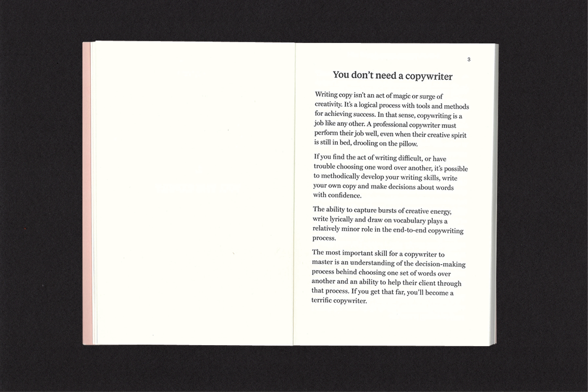 An accessible bookish format and page design were important first decisions in this project as the printing was to be done in editions by a trade paperback printer. Another bookish touch was the bookmark with tips for copywriting, printed on the same sheet as the cover for economy.