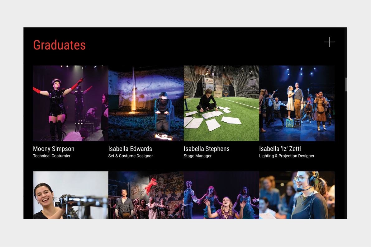 Full screen image rollover states for the menu items and some discovery sections of the site make great use of the extensive photography of productions, backstage and student work.